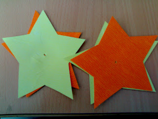 Cuando tengamos ya las estrellas recortadas las colocaremos una encima de otra y pegamos las esquinas. Hacer el agujero en uno de los extremos como en la foto.